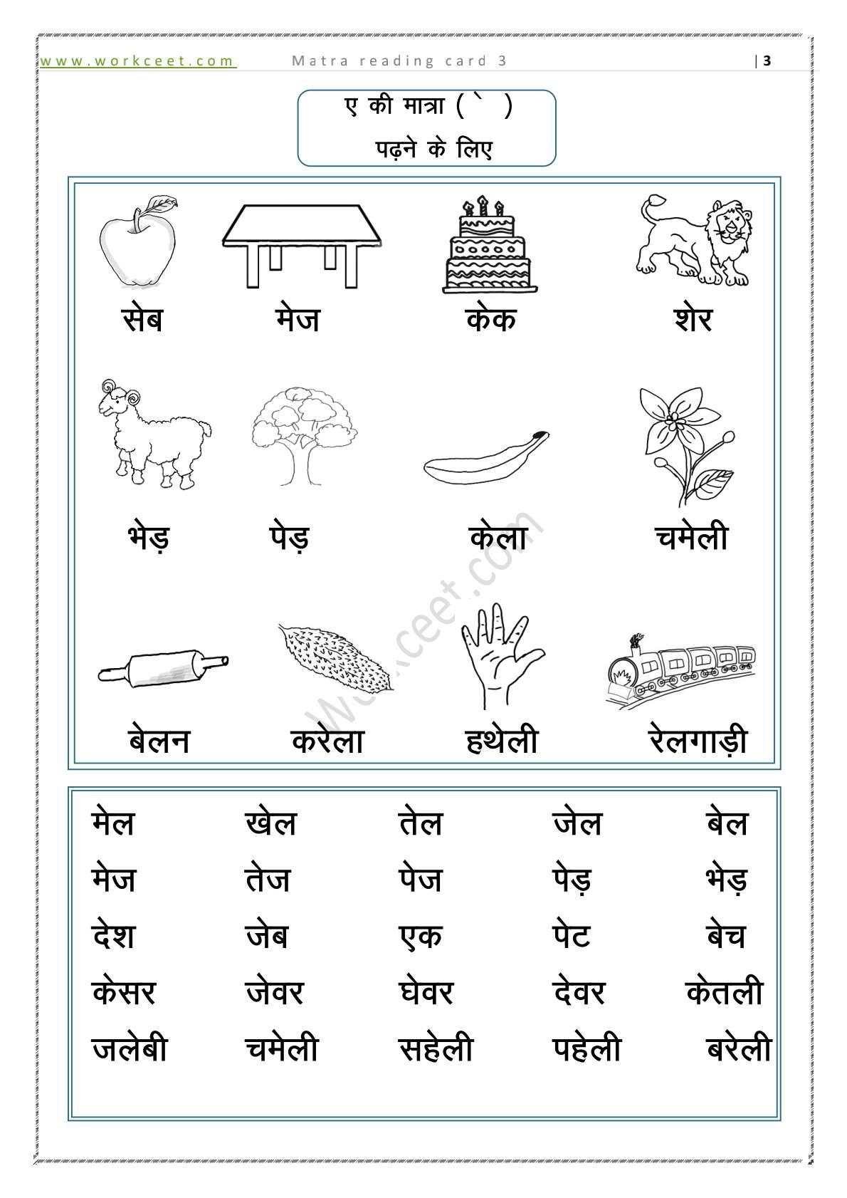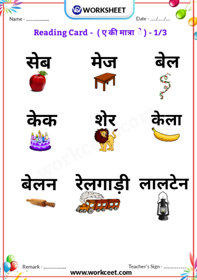 Ae ki Matra ( ए की मात्रा ) Reading Practice Sheet –