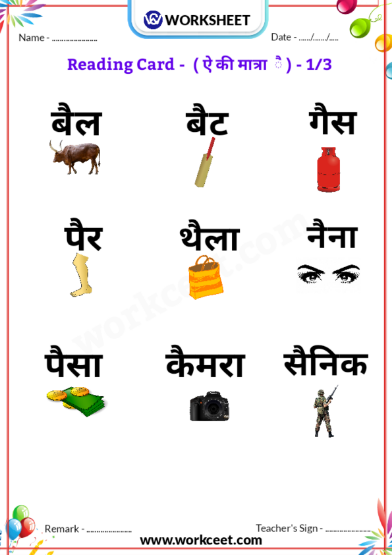 Ai ki Matra ( ऐ की मात्रा ) Reading Practice Sheet –