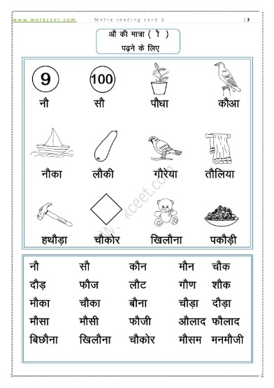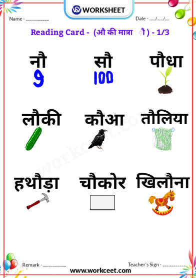 Au ki Matra ( औ की मात्रा ) Reading Practice Sheet –