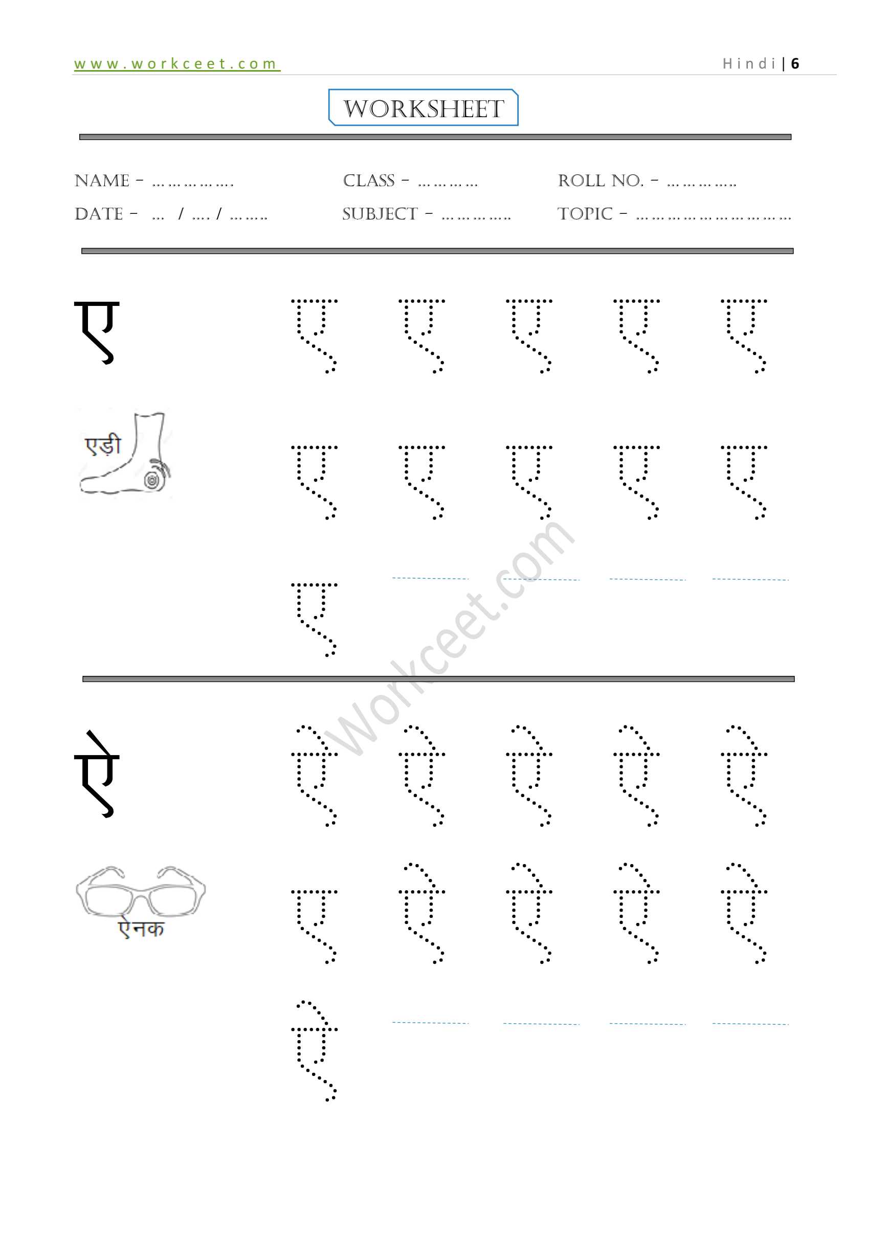 हिंदी वर्णमाला में Hindi Warnmala की वर्कशीट को दो भागों में बांटा गया है। एक तो स्वरों का लिखना, और एक व्यंजनों का लिखना । अक्षरों की शुरुआत बड़े आकार से होते हुए, छोटे आकार की तरफ क्रमश: की गई है। पुनरावृति का प्रयोग विद्यार्थियों को लिखने का स्थाई ज्ञान प्राप्त करवाता है । शुरुआत में चित्रों के साथ संबंध स्थापित करके, स्वतंत्र लेखन की ओर विद्यार्थी को बढ़ाने का प्रयास किया गया है । इसी प्रकार अक्षरों को छापने से शुरुआत करा कर, आत्मनिर्भर बनाने की ओर विद्यार्थी को ले जाया गया है । एक सीट का प्रयोग कम से कम 2 दिन तक किया जाना चाहिए । फिर भी यदि कुछ अक्षरों को लिखने में समस्या बनी रहे तो कृपया उसे ध्यान में रखते हुए आगे की सीट पर कार्य करना फायदेमंद रहेगा । क्योंकि कुछ अक्षरों की बनावट को समझने में विद्यार्थी समय लगाते हैं।
