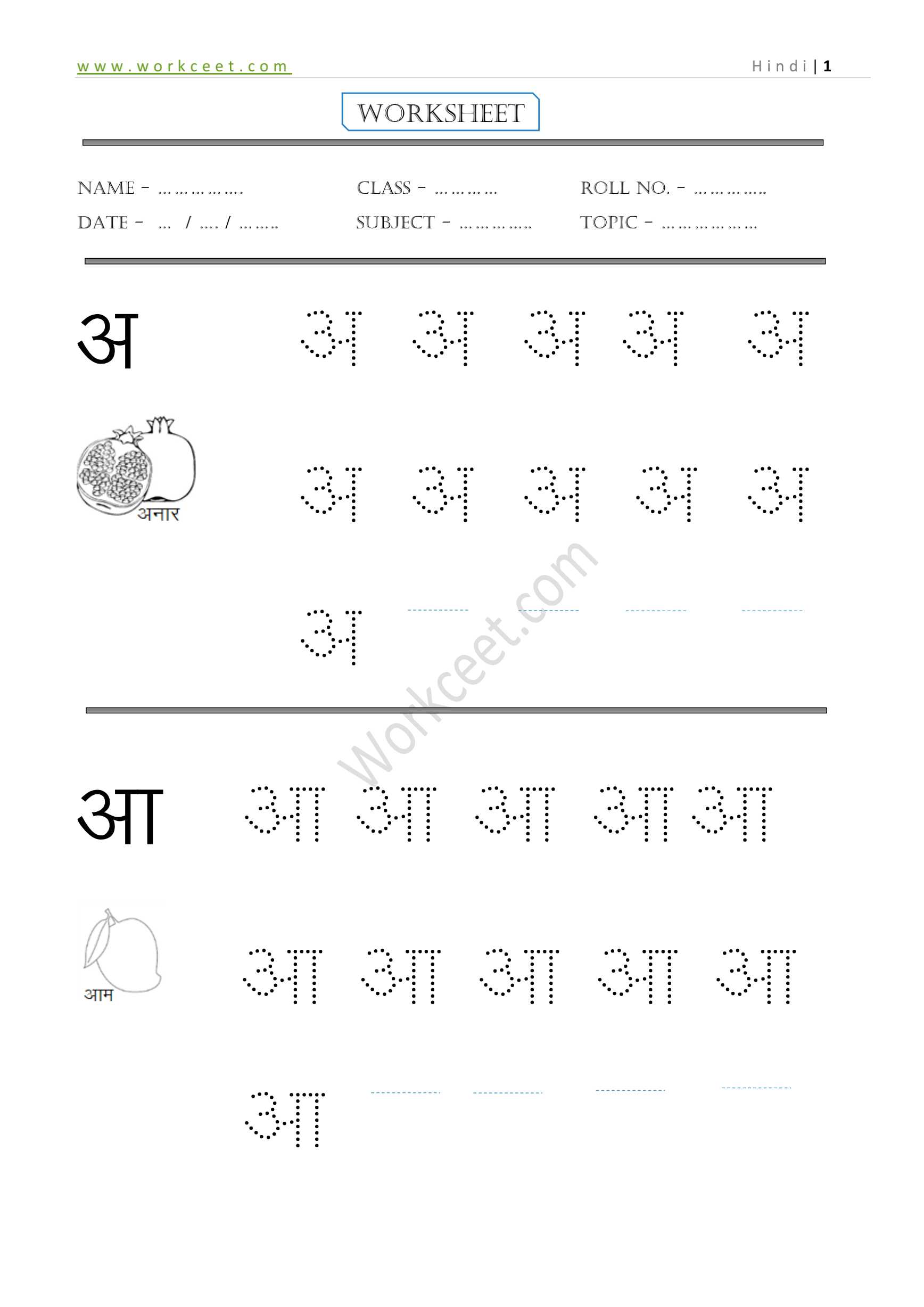 हिंदी वर्णमाला में Hindi Warnmala की वर्कशीट को दो भागों में बांटा गया है। एक तो स्वरों का लिखना, और एक व्यंजनों का लिखना । अक्षरों की शुरुआत बड़े आकार से होते हुए, छोटे आकार की तरफ क्रमश: की गई है। पुनरावृति का प्रयोग विद्यार्थियों को लिखने का स्थाई ज्ञान प्राप्त करवाता है । शुरुआत में चित्रों के साथ संबंध स्थापित करके, स्वतंत्र लेखन की ओर विद्यार्थी को बढ़ाने का प्रयास किया गया है । इसी प्रकार अक्षरों को छापने से शुरुआत करा कर, आत्मनिर्भर बनाने की ओर विद्यार्थी को ले जाया गया है । एक सीट का प्रयोग कम से कम 2 दिन तक किया जाना चाहिए । फिर भी यदि कुछ अक्षरों को लिखने में समस्या बनी रहे तो कृपया उसे ध्यान में रखते हुए आगे की सीट पर कार्य करना फायदेमंद रहेगा । क्योंकि कुछ अक्षरों की बनावट को समझने में विद्यार्थी समय लगाते हैं।