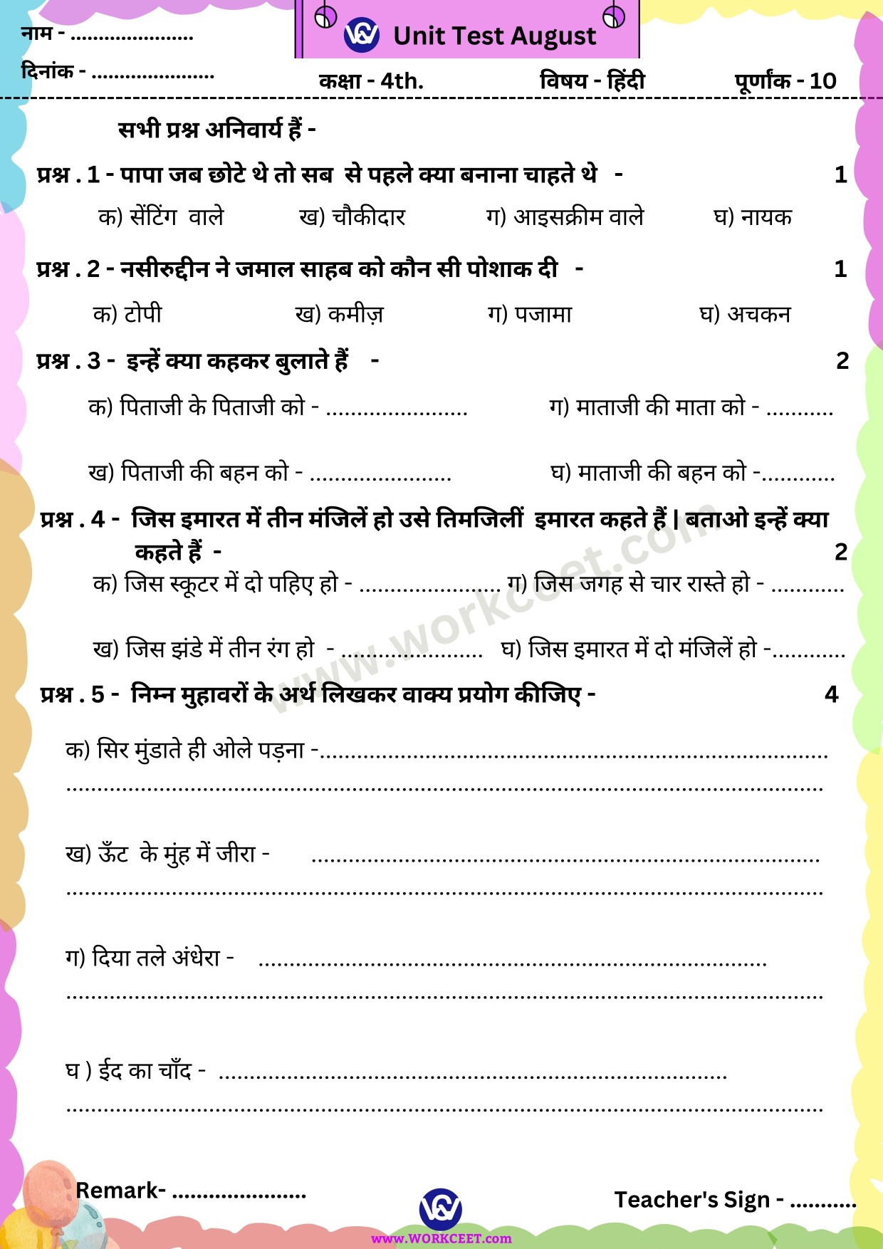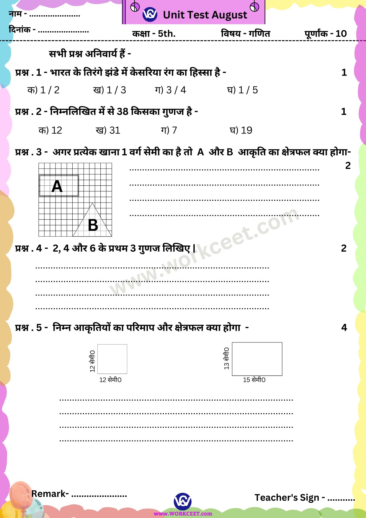 मासिक एवं इकाई परीक्षण प्रश्नपत्र