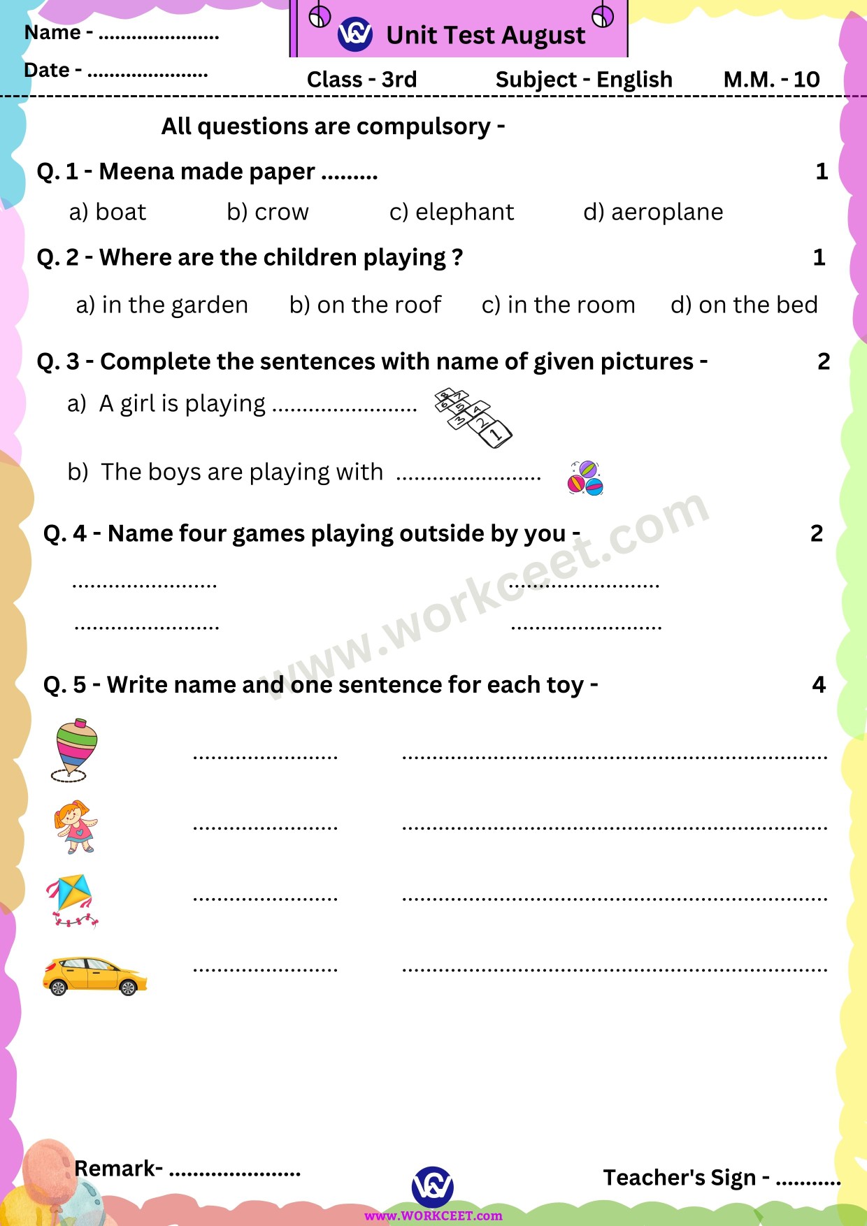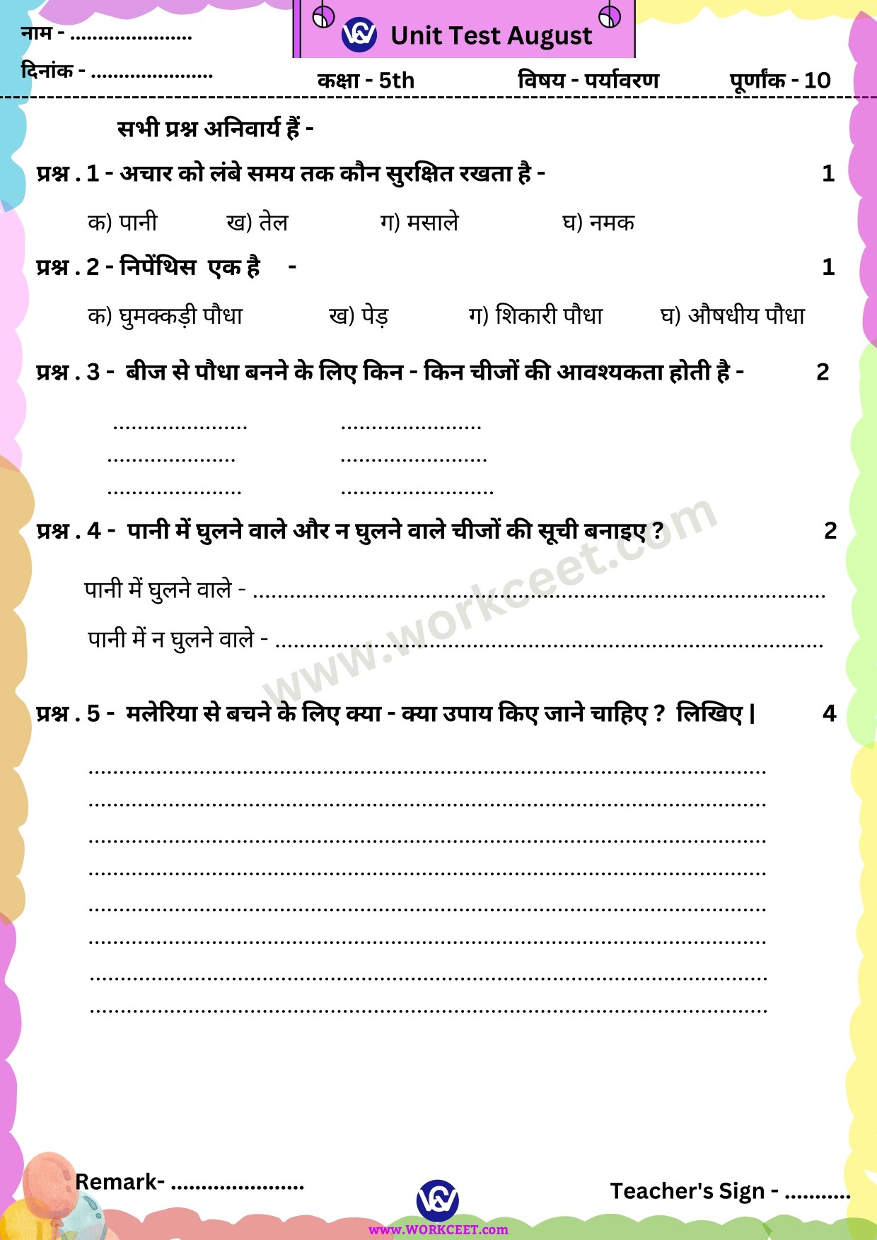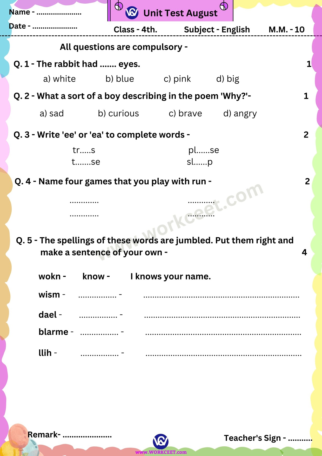 Click Here Download PDF Unit Test August Class – 5th