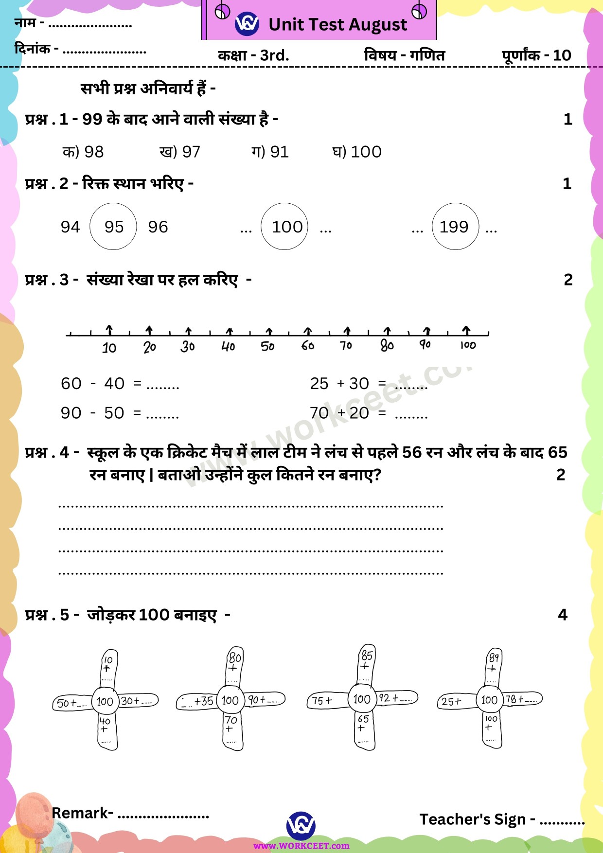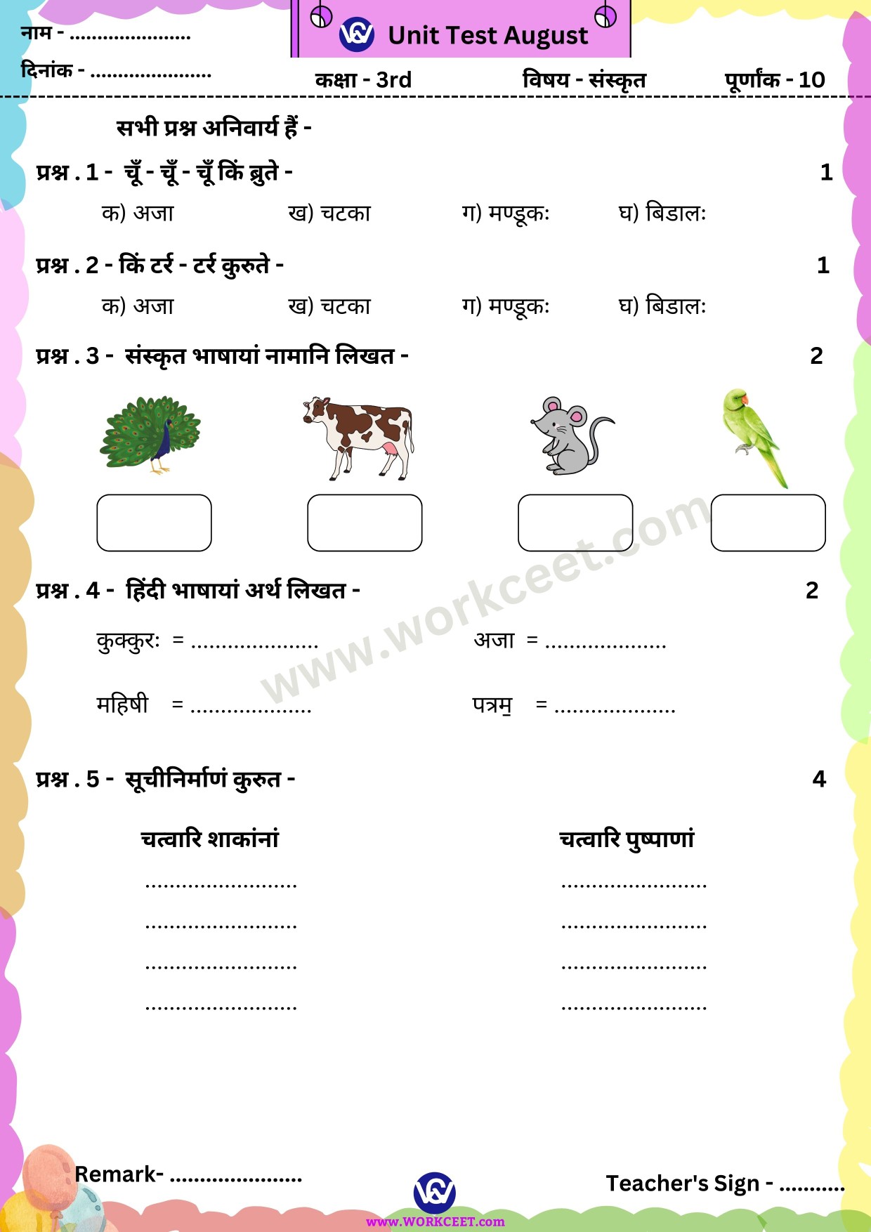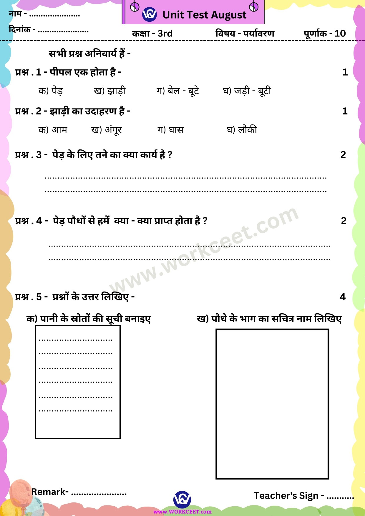 Click Here Download PDF Unit Test August Class – 5th