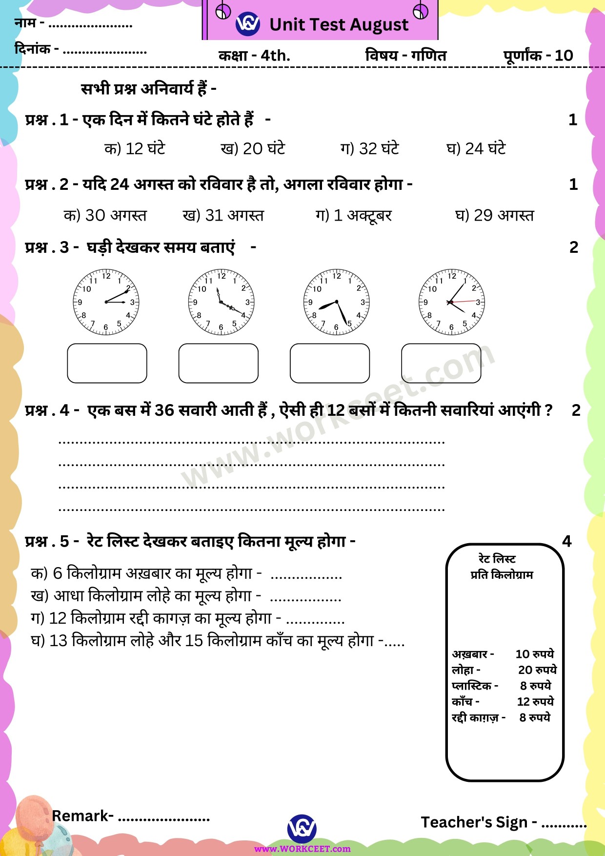 Click Here Download PDF Unit Test August Class – 4th